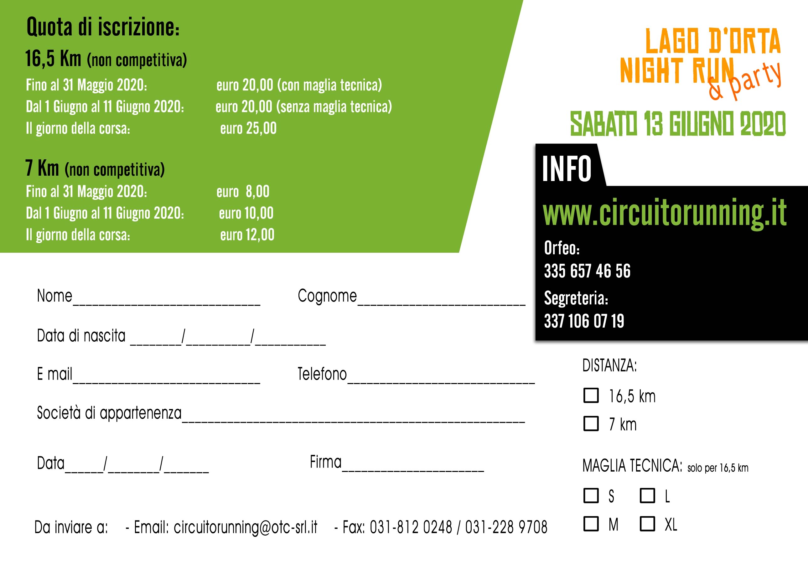 Banca Unicredit filiale di Borgomanero - IBAN : IT 74 F 02008 45222 0001 009 68 603 - Causale del versamento: ISCRIZIONE Lago d'Orta Night Run 2018 (indicando i km)