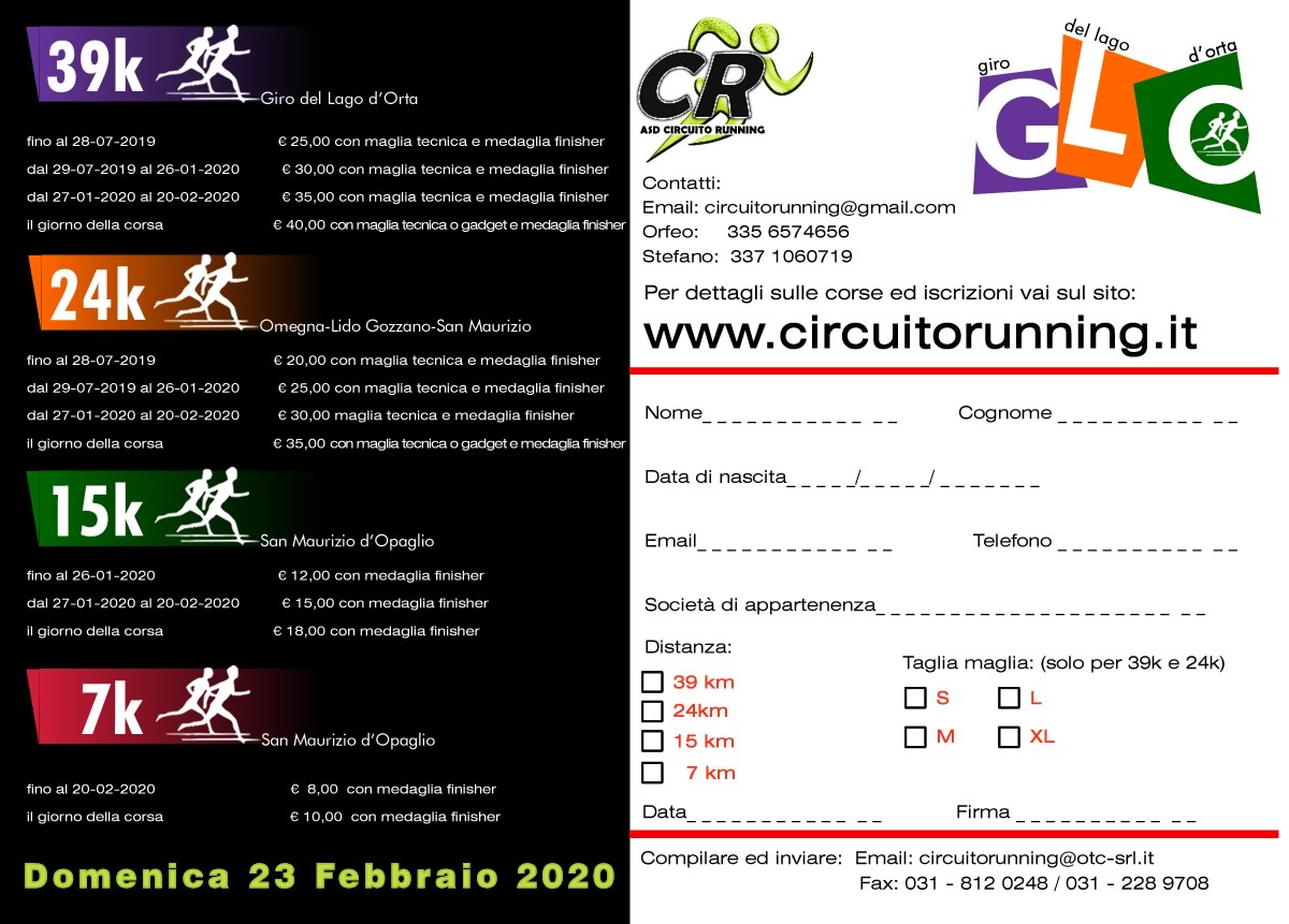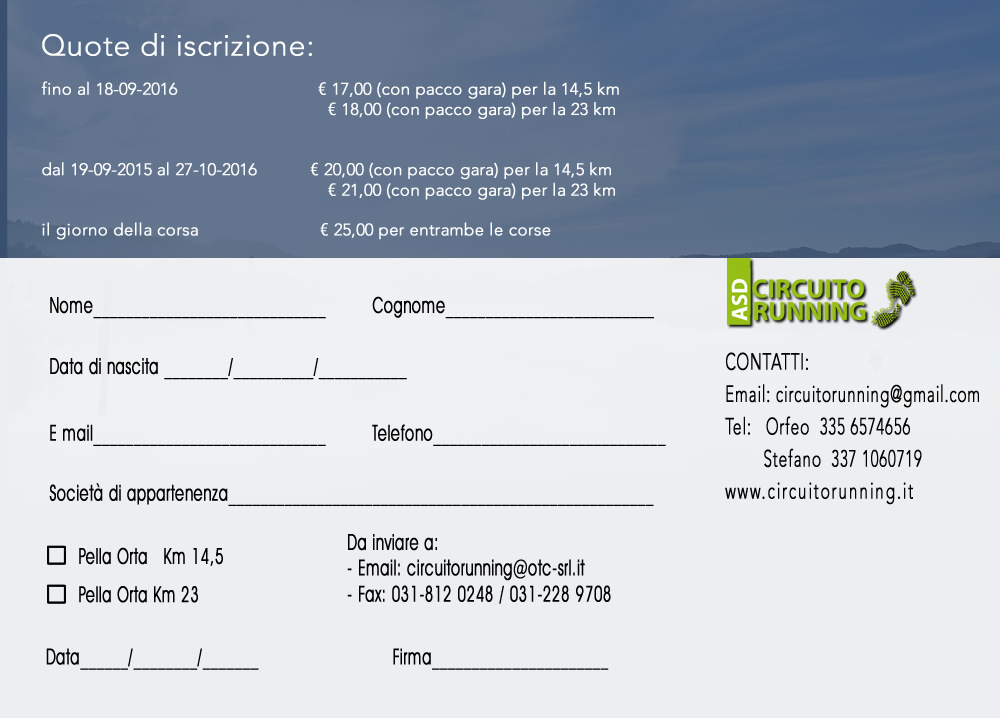 al nr. di Fax 031-8120248 oppure Fax 031-2289708 o via mail a Questo indirizzo email è protetto dagli spambots. È necessario abilitare JavaScript per vederlo. allegando la ricevuta di pagamento da farsi attraverso bonifico bancario intestato a : ASD Circuito Running (in caso di problemi scrivere per esteso Associazione Sportiva Dilettantistica Circuito Running)